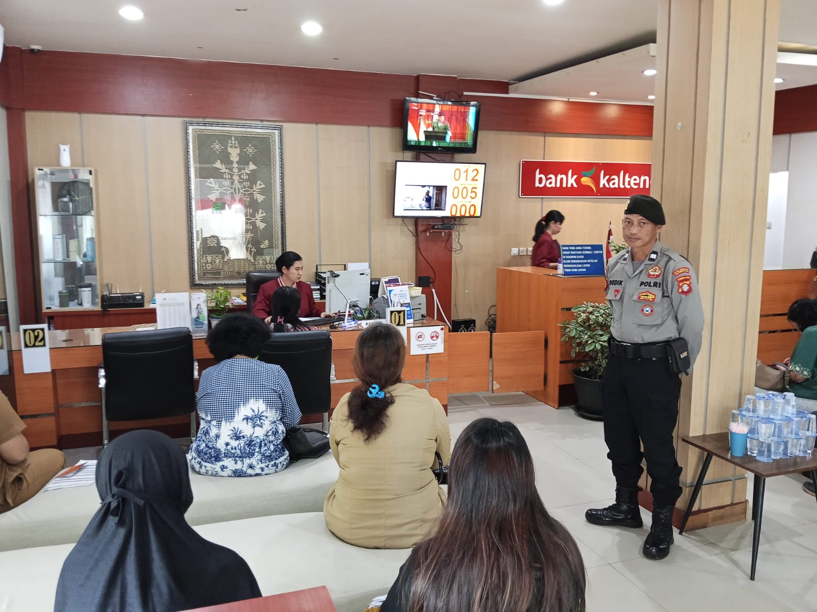 Selain memantau aktivitas nasabah, personel juga berkoordinasi dengan petugas keamanan bank serta mengamati situasi di sekitar area perbankan guna memastikan seluruh aktivitas berjalan tertib dan lancar.