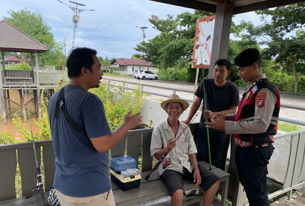 Personel patroli melakukan pemantauan situasi di sekitar kawasan wisata sekaligus berinteraksi langsung dengan masyarakat yang sedang memancing dan beraktivitas di tepian Sungai Kahayan.