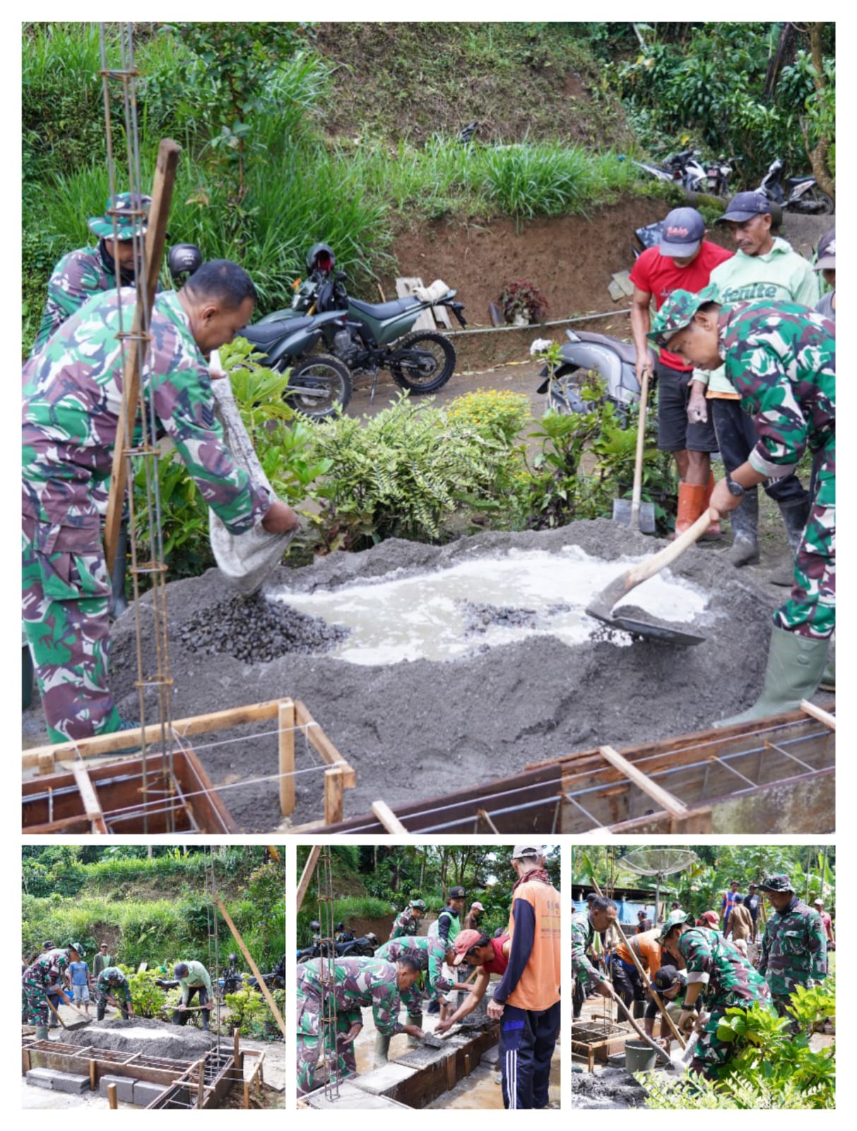 Kegiatan ini merupakan bagian dari sasaran fisik TMMD yang bertujuan membantu percepatan pembangunan rumah layak huni bagi warga kurang mampu. Dengan penuh semangat, anggota TNI dan warga setempat bahu-membahu mengaduk material dan melakukan pengecoran pondasi rumah secara gotong royong.